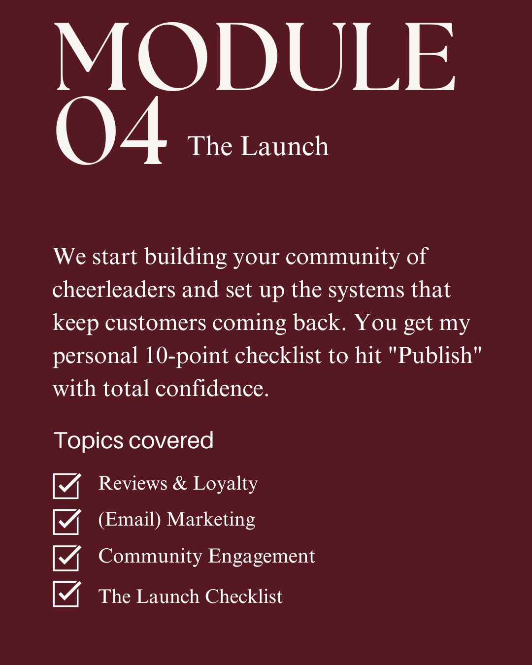 We build your community of cheerleaders and set up the systems that keep customers coming back. Youâll get my personal 10-point checklist to hit "Publish" with total confidence.