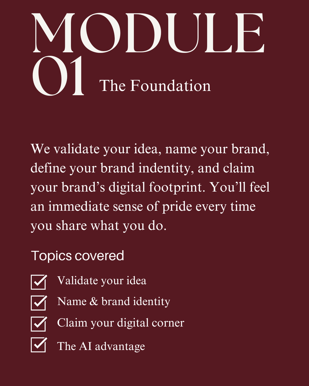 I created this program because I want to share the roadmap I wish I had. Iâm not a 'business guru' and I don't have a 40-person team. Iâm a founder who built her brands at the kitchen table. My mission is to help you develop the skills by giving you a repeatable, fluff-free system so you can reclaim your creative edge and build a professional brand you are proud to share.