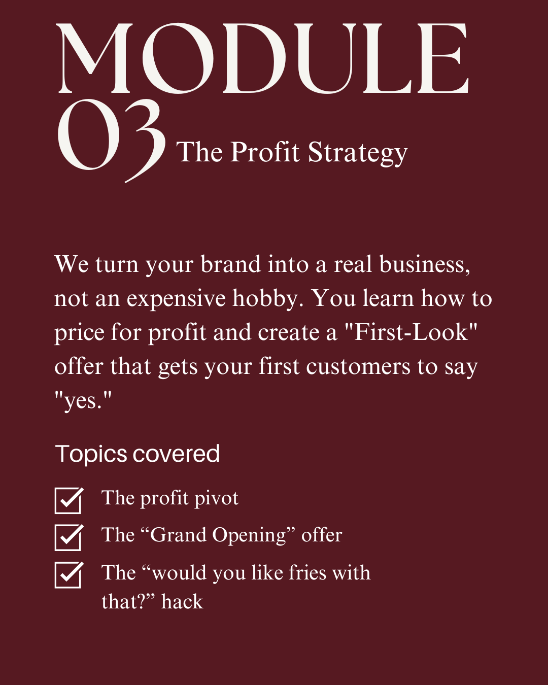 We turn this into a real profitable business, not an expensive hobby. You'll learn how to price for profit and create a "Grand-Opening" offer that gets your first customers to say "yes."STEP 4: THE LAUNCH